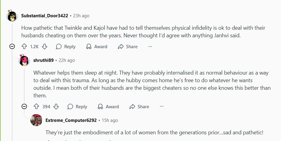 Fans have strongly blasted the trio for their absurd opinions. While the majority of statements reflect the disagreement with Twinkle Khanna and Kajol, one of comment went noticeable which says that “They are just openly acknowledging about the deeds of their husbands “. The comment has received around 2.3K upvotes till now.