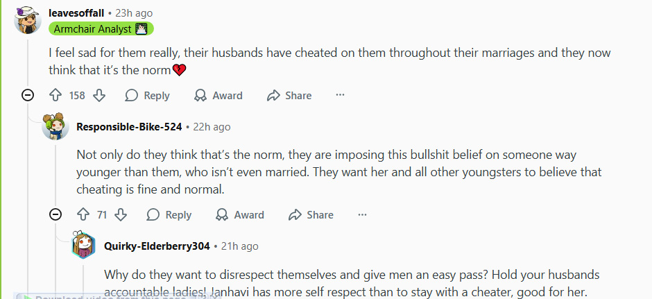 Redditors went on to praise Jhanvi Kapoor for her stand that infidelity will be a deal-breaker for her. Netizens opined that despite being in her 20s, she has much wiser perspective on this aspect.