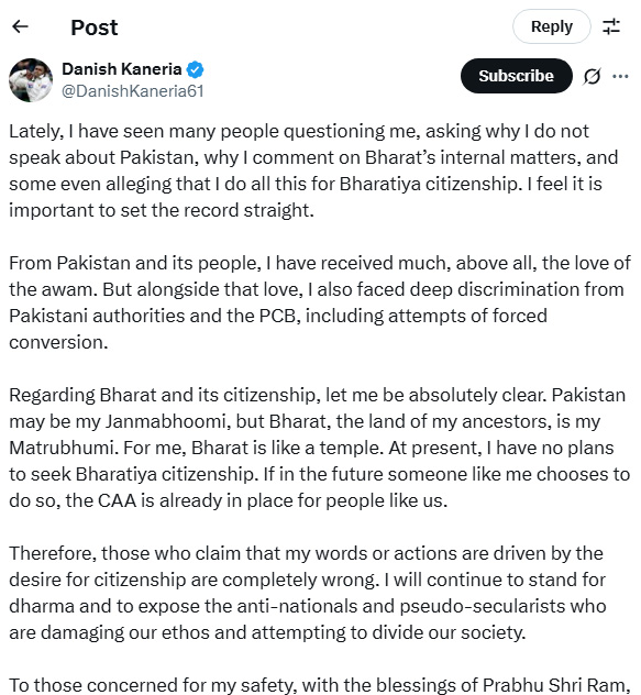 The Indian origin Pak Cricketer, who is also the 4th highest wicket taker for Pakistan has denied allegations that he critizes Pakistan in order to gain Indian citizenship. Danish opined that he has no intentions as of now to seek Indian citizenship however, he admits that if the need arises for him to seek Indian citizenship, then he will do it through CAA act.