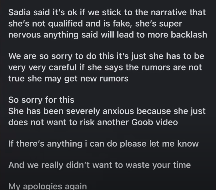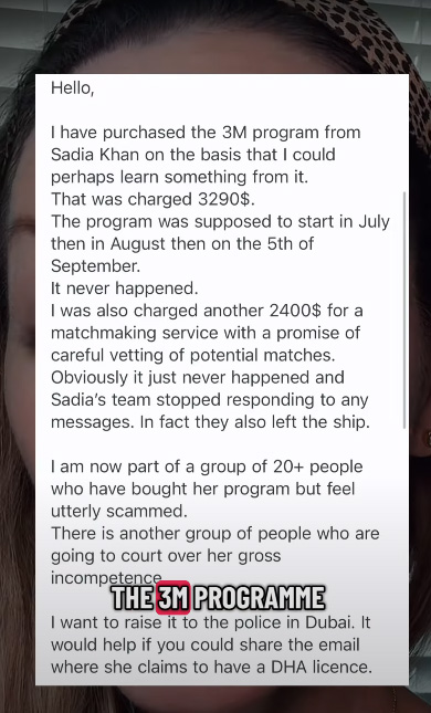 Dr. Taylor Furrowes’s, who has questioned Sadia Khan’s degree claims for a long time, have now shared shocking details on her Youtube video alleging that a user has came forward sharing his ordeal on how he was scammed by Sadia Khan for $3290(for a program) and for another $2400 for matchmaking which the user claims never happened and that Sadia’s team stopped responding to him.